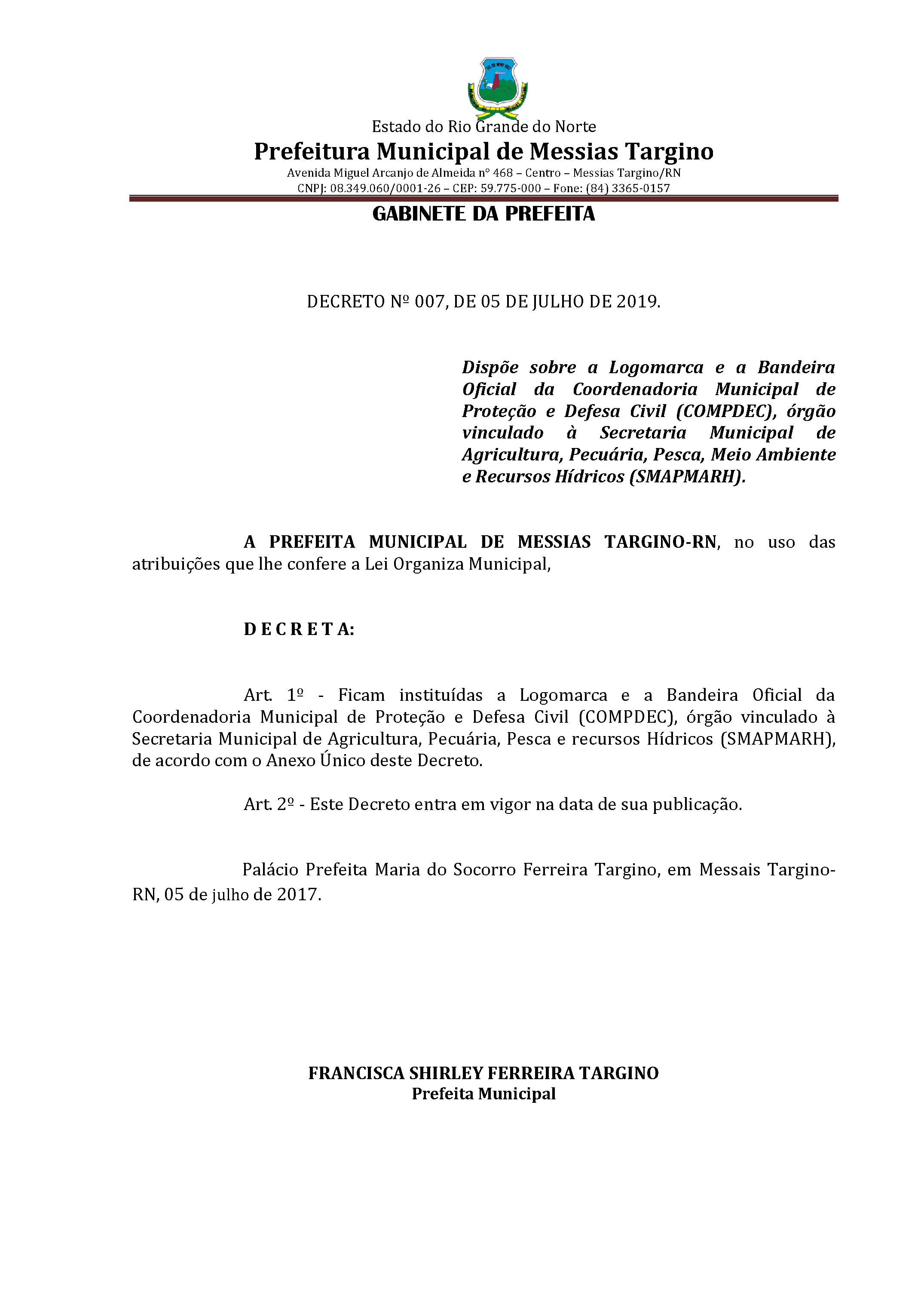 DECRETO Nº 007, DE 05 DE JULHO DE 2019.