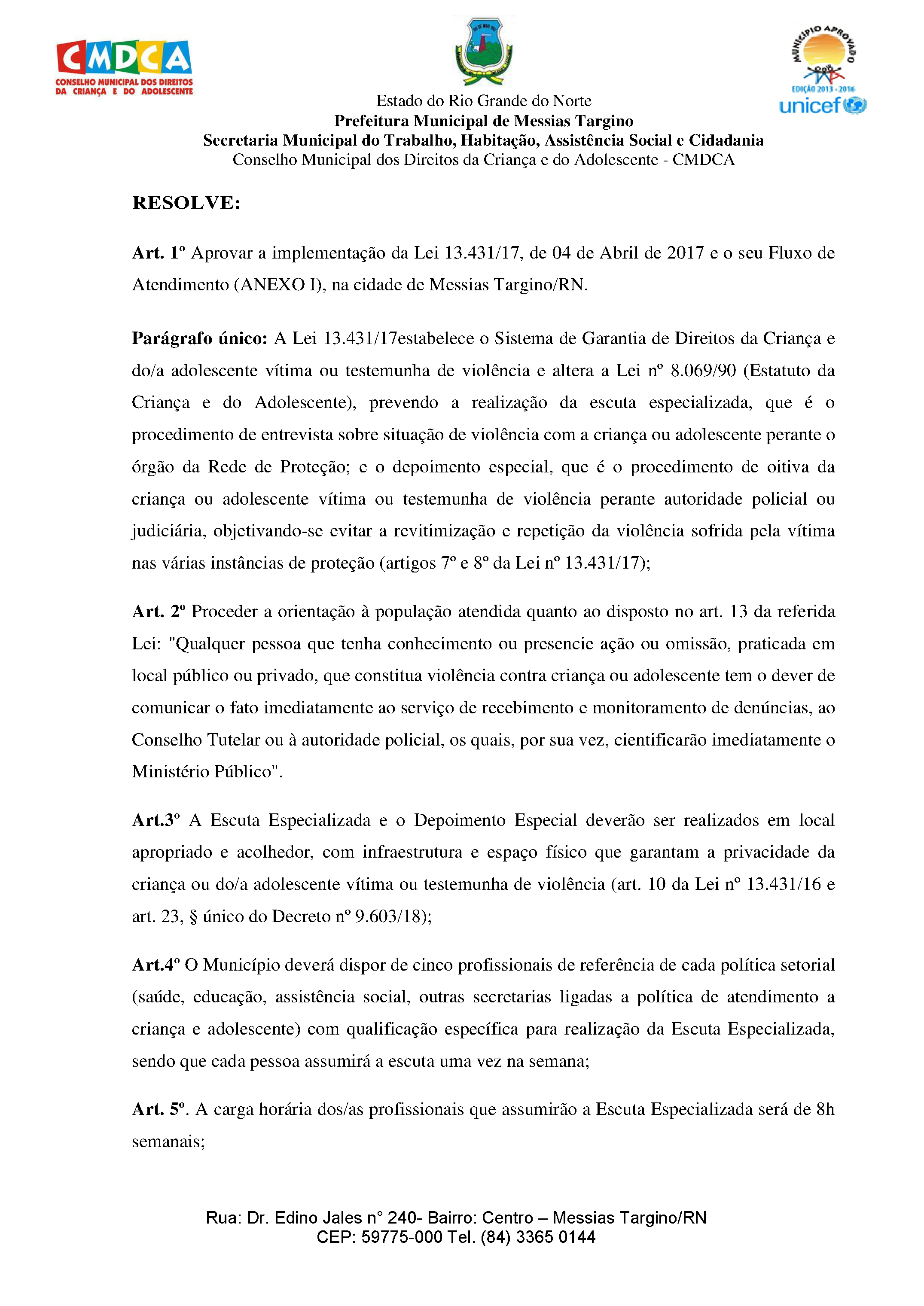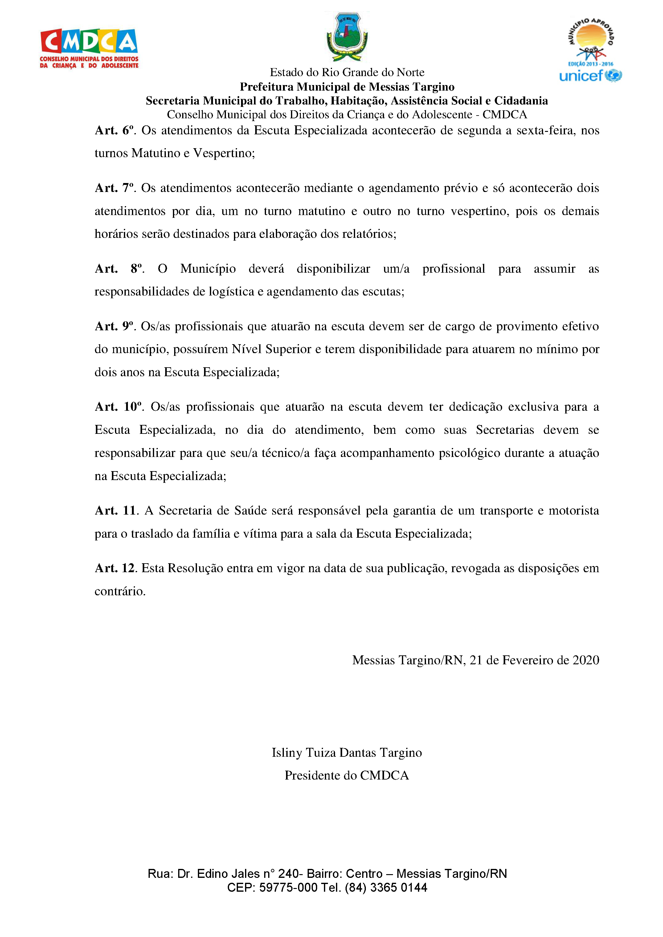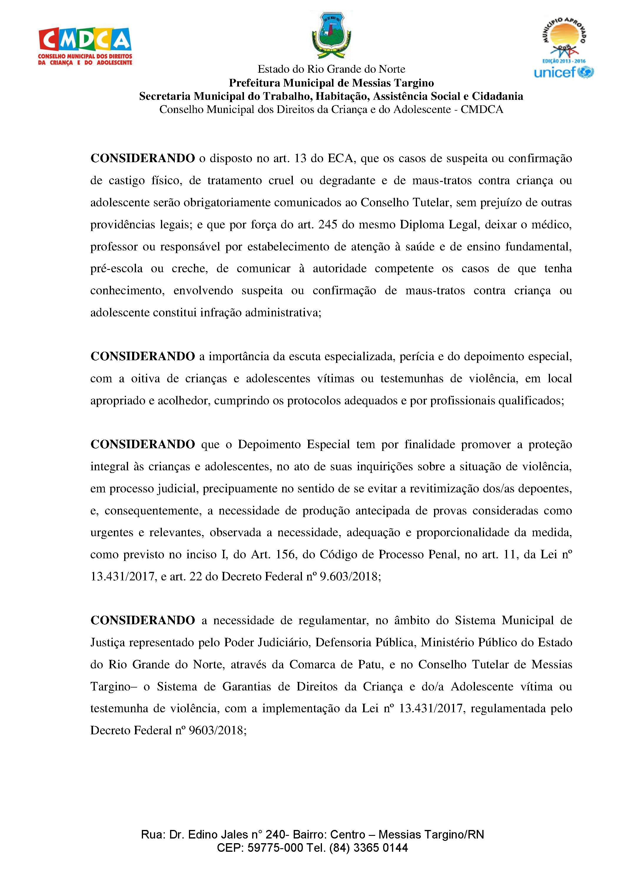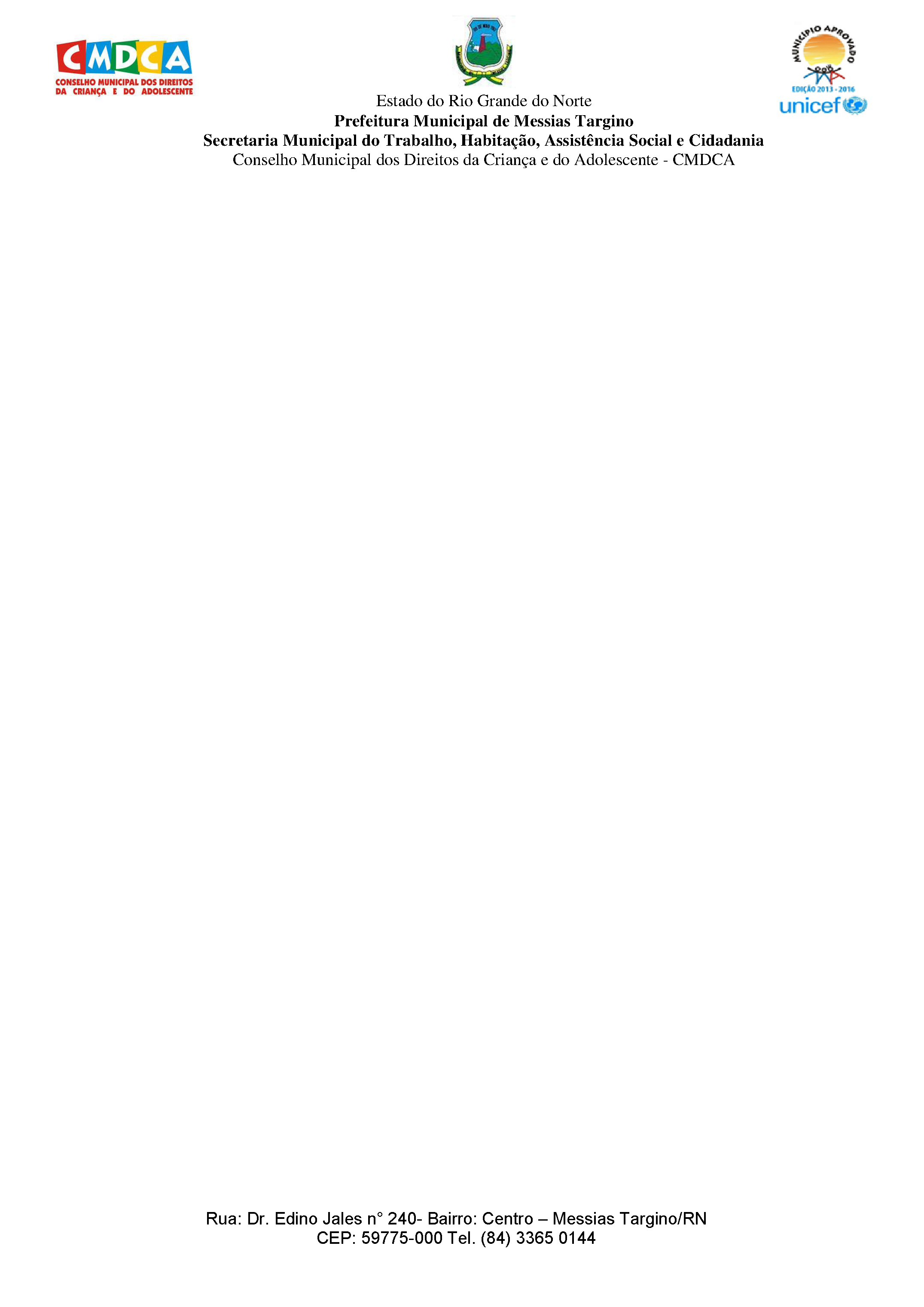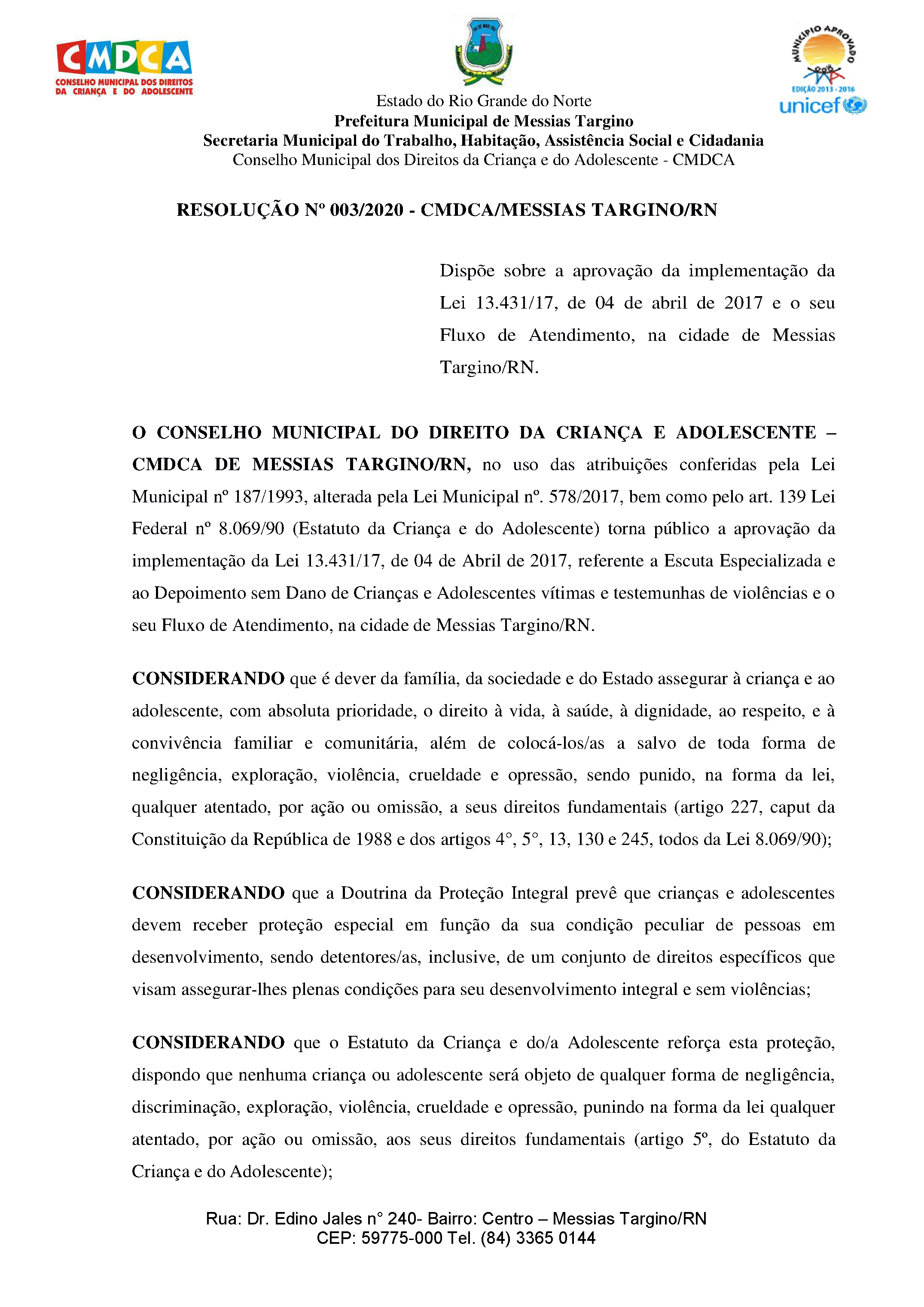 RESOLUÇÃO Nº 003/2020 - CMDCA/MESSIAS TARGINO/RN