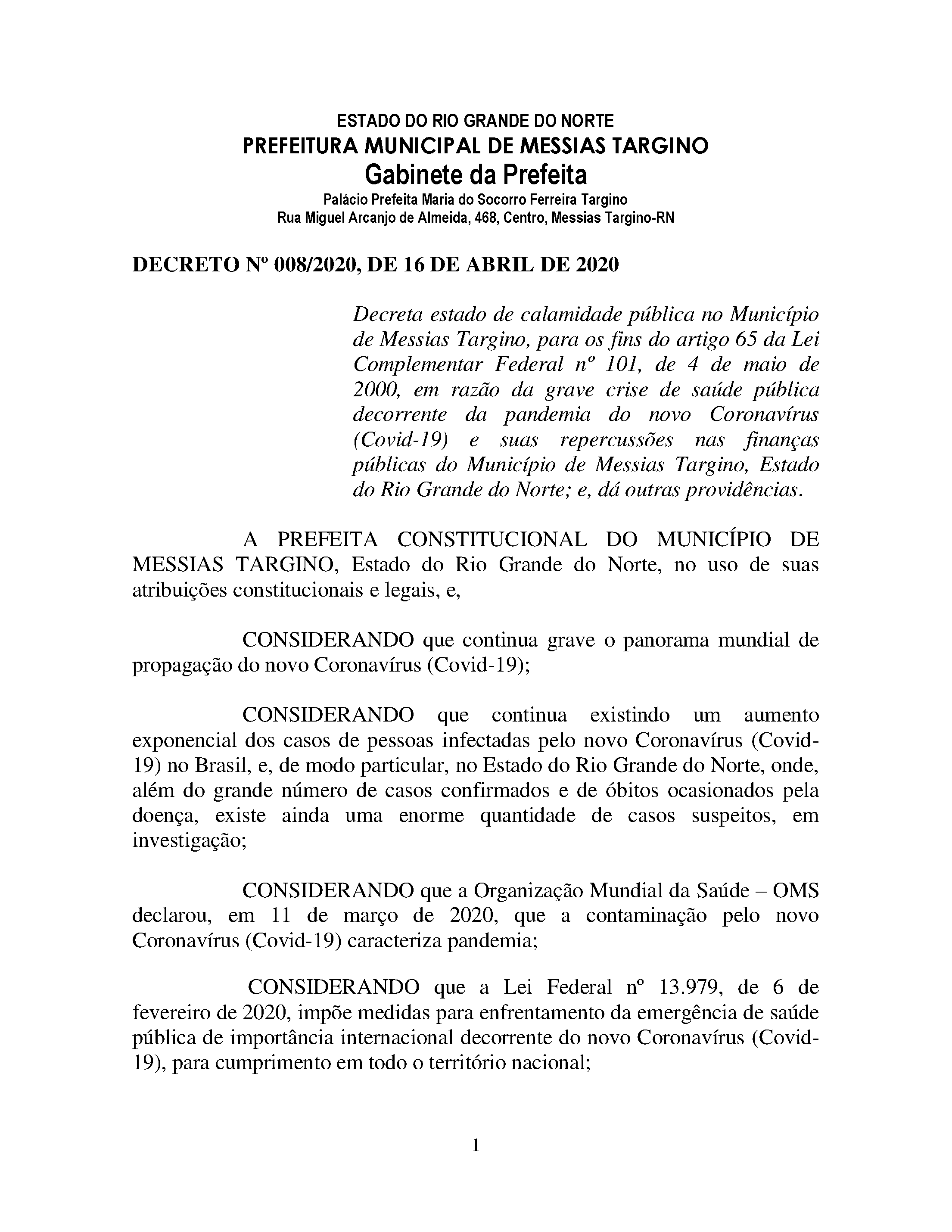 DECRETO Nº 008/2020, DE 16 DE ABRIL DE 2020