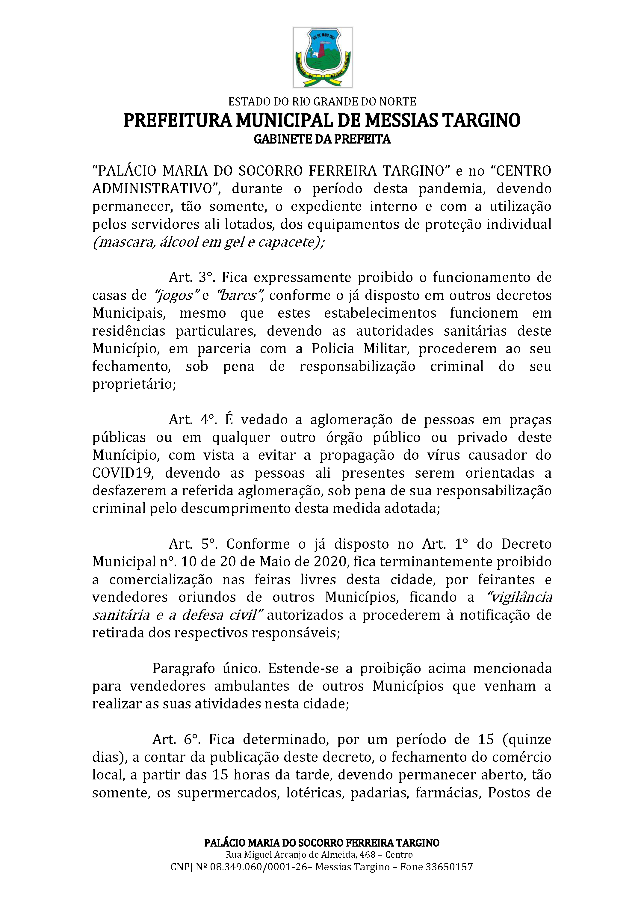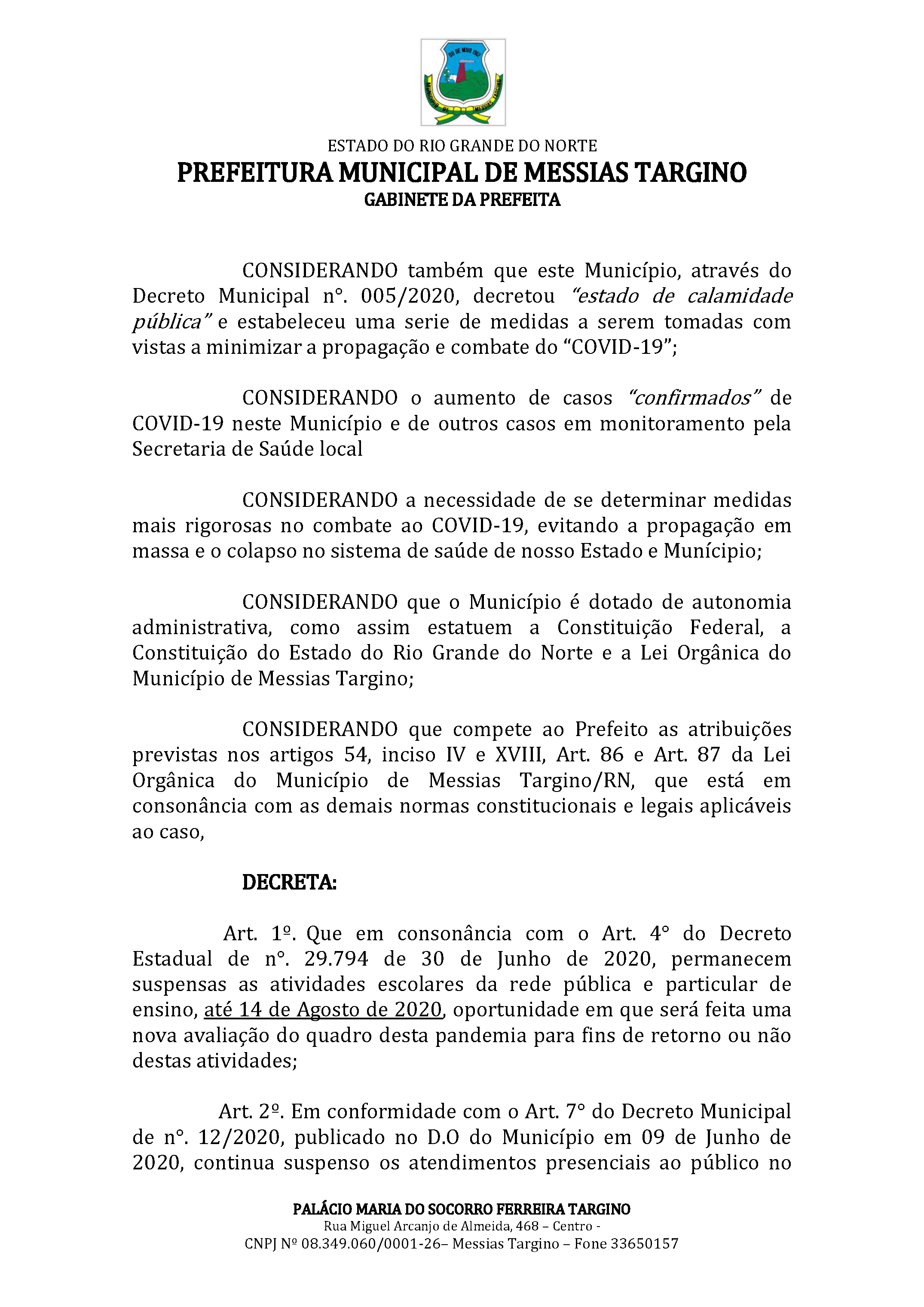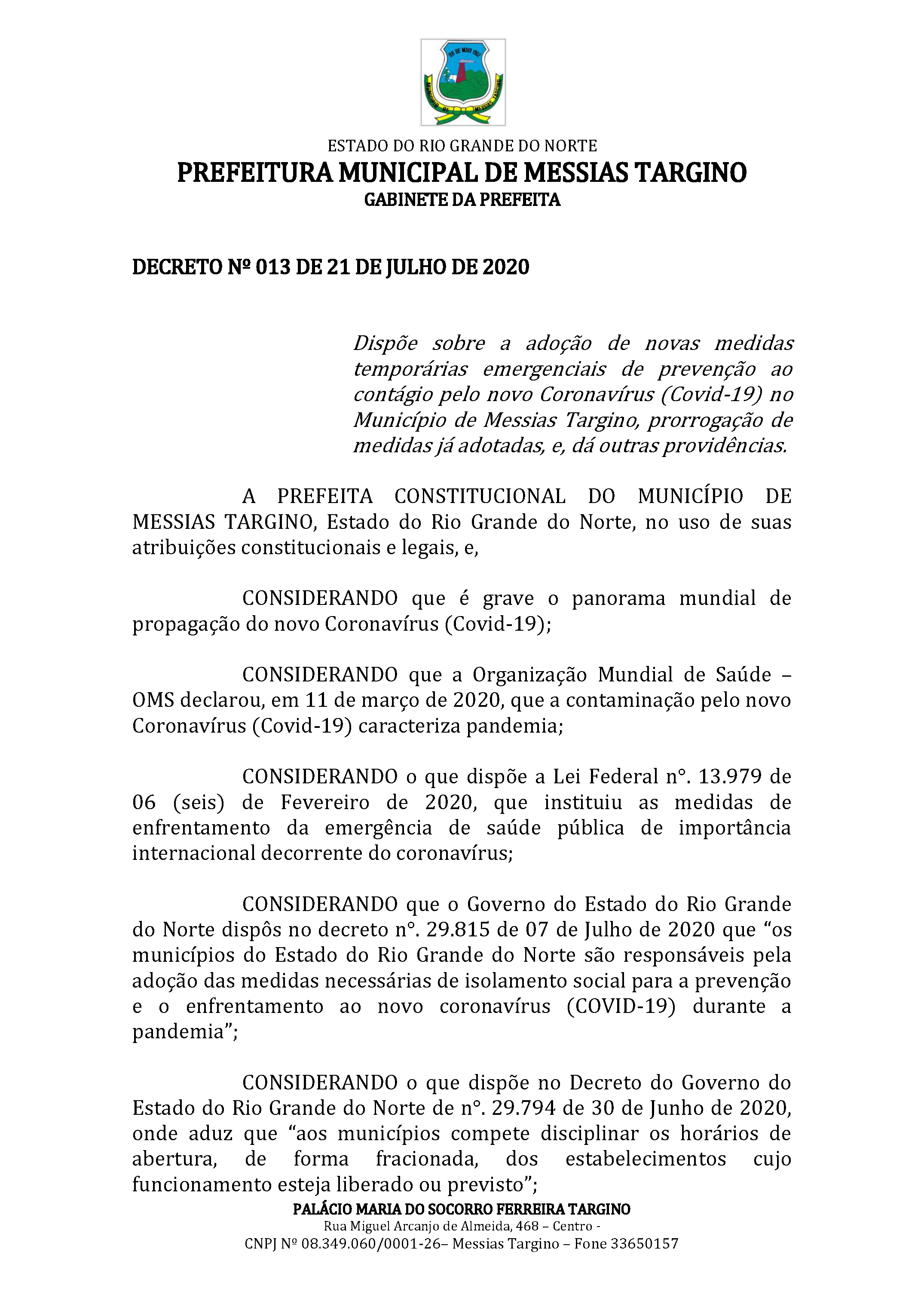 MATÉRIA EXTRAORDINÁRIA - DECRETO Nº 013 DE 21 DE JULHO DE 2020