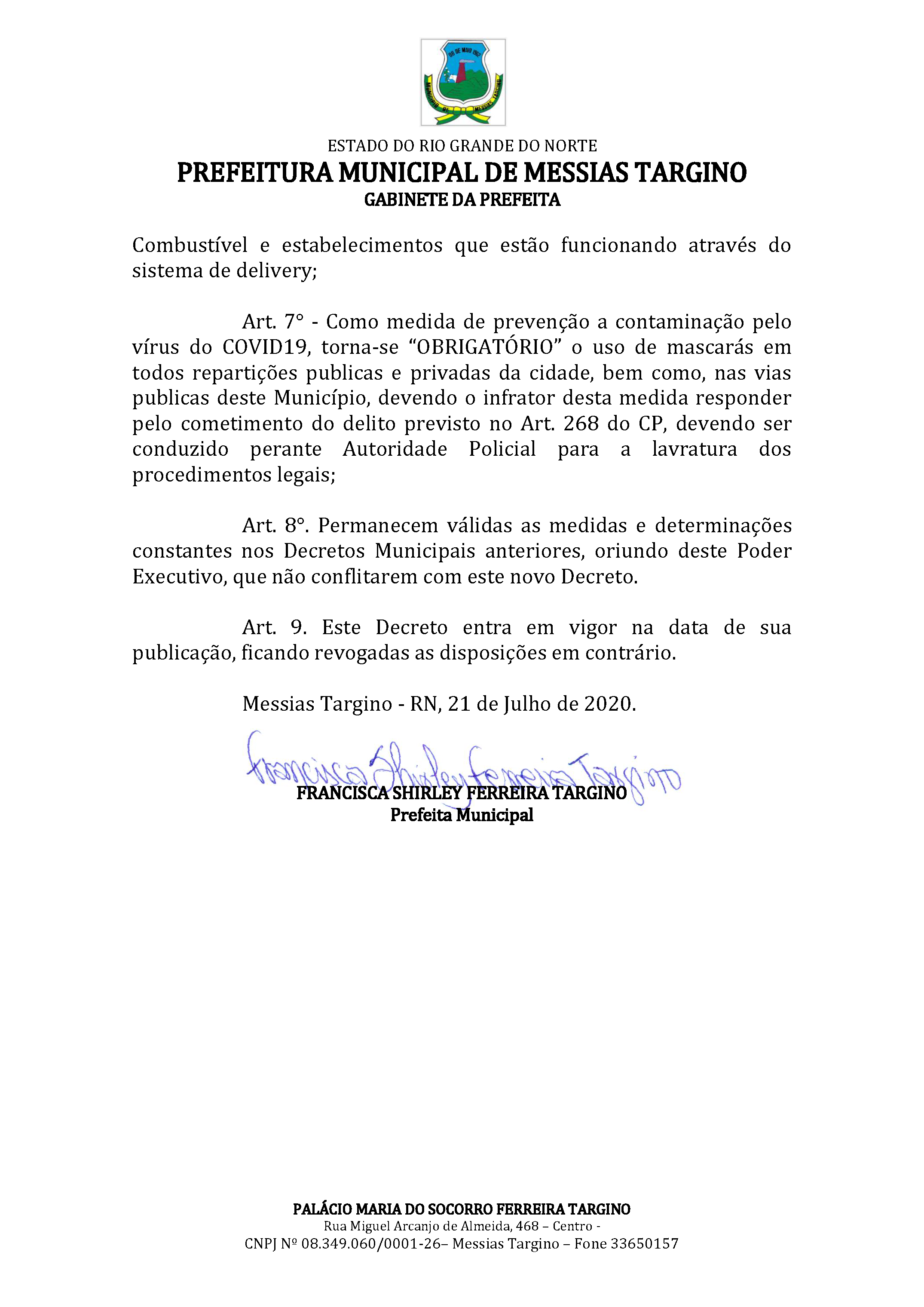 Conforme MP n° 2.200-2 de 24/08/2001, que institui a infraestrutura de chaves Públicas. Matéria Publicada no Diário Oficial do Município de Messias Targino/RN no dia 21/07/2020 - Edição 17.